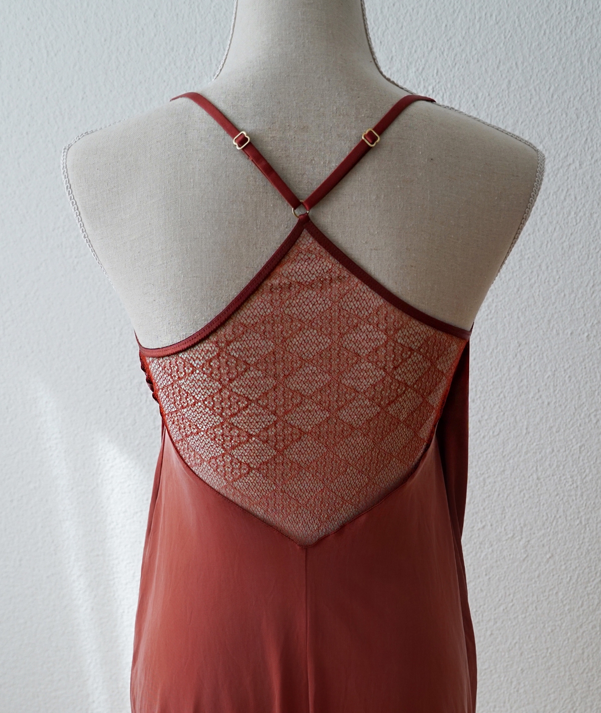 The slip dress by moya kala, a small Swiss company, consists of the material Cupro, a biodegradable textile fiber. This fiber cannot be processed into cotton yarn, which is why it ended up in waste. However, a process was developed to manufacture knitwear with it. The material for the high-quality lace was sourced from the Swiss manufacturer Bischof Textil.